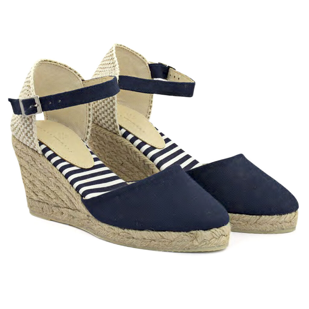 Wedge espadrille in 100% recycled cotton canvas lined in leather Heel in woven cotton yarn with ankle strap and buckle closure.